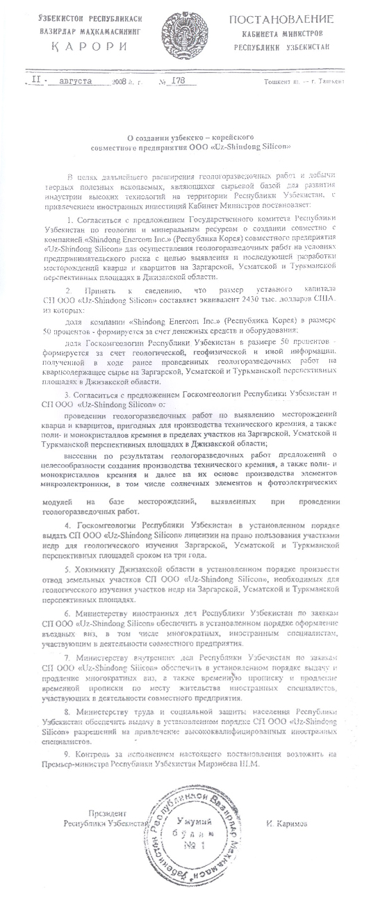 »ç ¡°Shindong Enercom Inc."(´ëÇѹα¹)¿Í ÇÔ²² JV "Uz-Shindong Silicon"¼³¸³¿¡ °üÇÑ